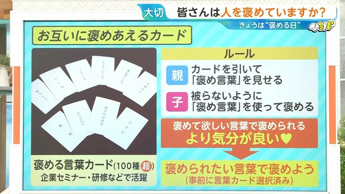 「センスいい」「さすが」「伸びしろがある」など、100種を超える言葉が書いてあり、ひとりが引いた「ほめ言葉」を使って、他の人と被らないようにその人を褒めます。
