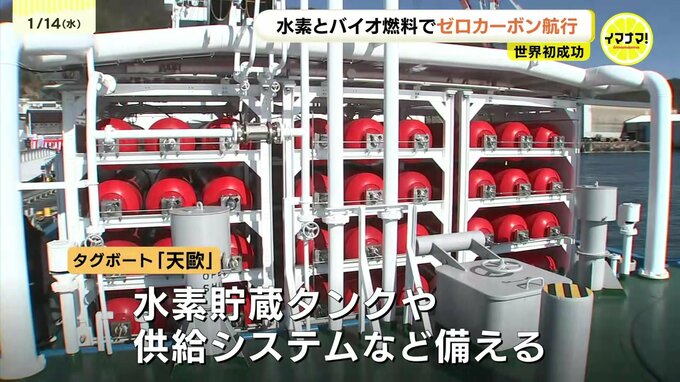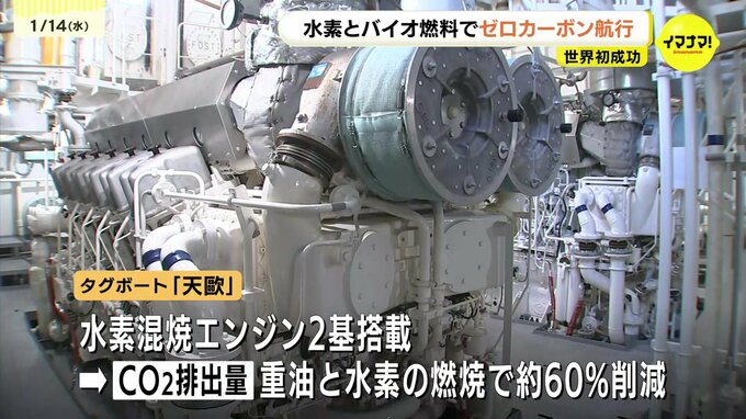 船内には「水素混焼エンジン」を2基搭載。今後は、重油と水素を混合して燃やすことで、CO2の排出量は化石燃料のみと比べ、約60%削減できるということです。また水素を貯めるタンクや、供給システムなども備えられています。