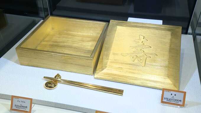「入り口には、黄金の打掛、光り輝いています。そして、この展示販売会で一番高いのがこちら!重箱です。1億円、高すぎる~!」