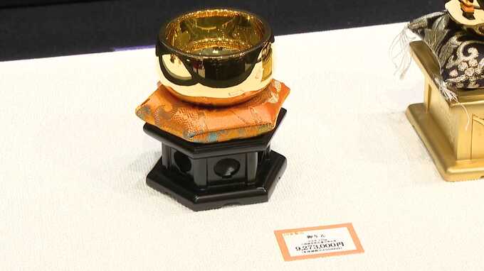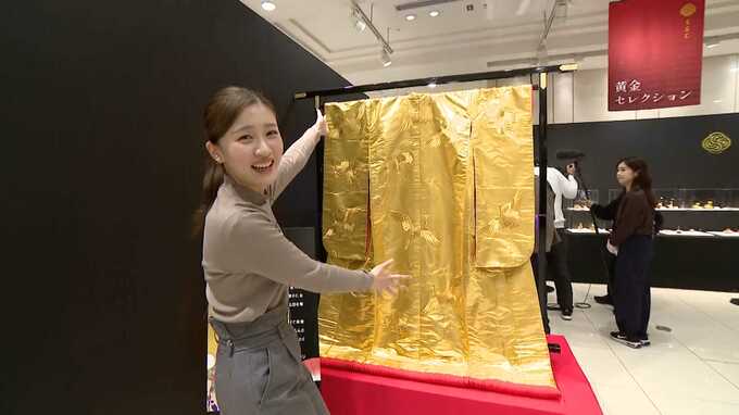 九州初公開!黄金の鶴が豪華絢爛に羽ばたく打掛「飛翔鶴」や、1億円超えの純金重箱など、新春を彩る縁起物の金製品の数々が並んでいます。