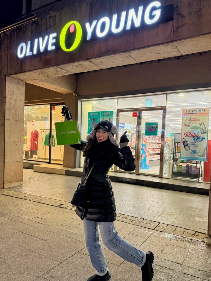 人気ショッピングスポット『オリーブヤング』の前ではショッピング袋を手にポーズを決めており、買い物は無事に楽しめたようです。
