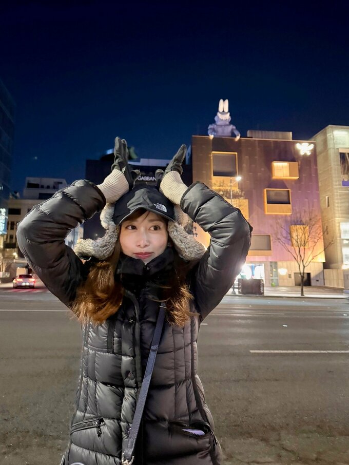 それでもダウンジャケットに耳当て付きの帽子と、防寒対策ばっちりな着こなしの中川さんは、「極寒の中、おさんぽしながら有名なオリーブヤングに寄ったり カフェに入ってみたり...」と綴り、韓国の夜の街を楽しむ様子を見せています。