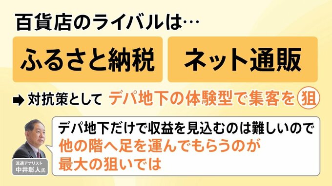 ふるさと納税やネット通販などにより、特別な品などの購入機会が減っており、その対策として、デパ地下は、体験型での集客を狙っています。
