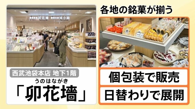 西武池袋本店の地下1階にある「卯花墻(うのはながき)」では各地の銘菓が揃っています。普通は“箱売り”をイメージしますが、こちらは一個から販売されています。