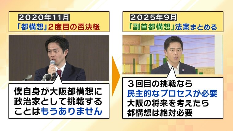 2度、僅差で否決されてきた都構想。しかし、副首都構想の法案をまとめた2025年9月には「3回目の挑戦なら民主的なプロセスが必要。大阪の将来を考えたら都構想は絶対必要」と発言。再び意欲を見せています。