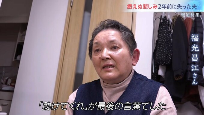 「家の2階の大屋根が、バサッと落ちたんです。バサッと落ちた瞬間、『キャーッ』て言って何がなんだかわからなくなって。その場で主人はうつ伏せになって。何か当たって、木の梁とか柱の梁とかが当たって、亡くなったと思いました。呼んでも返事も何もないし。『助けてくれ』が最後の言葉でした」