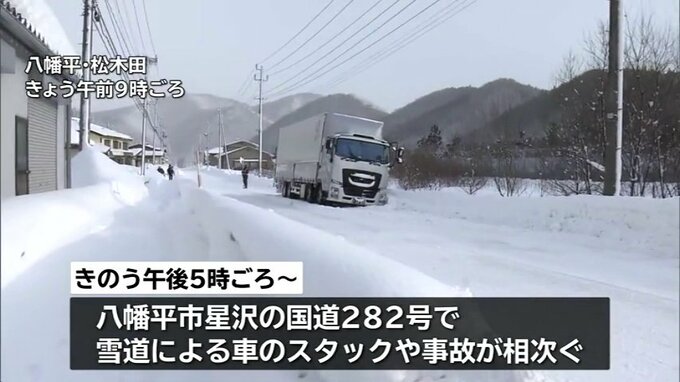 警察によりますと、14日午後5時ごろから八幡平市星沢の国道282号で雪道による車のスタックや事故が相次ぎました。