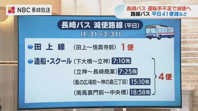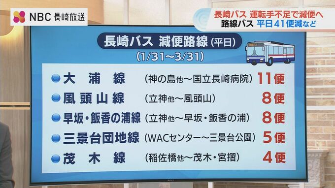 最も便数が減るのは長崎市の神の島と田上にある「国立長崎病院」の区間を走る大浦線で11便。