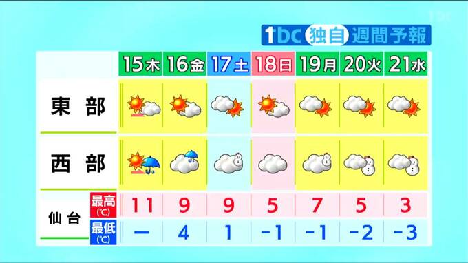 来週後半は寒さもだんだん厳しくなっていき、仙台では最高気温が3℃前後までしか上がらない日がしばらく続く可能性も出てきています。今後の情報に注意してください。