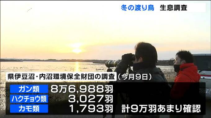 宮城県伊豆沼・内沼環境保全財団が1月9日に伊豆沼周辺で行った独自調査によりますと、ガン類が8万6988羽、ハクチョウ類が3027羽、カモ類が1793羽で合わせて9万余りの渡り鳥が確認されていてほぼ例年並みに飛来しています。
