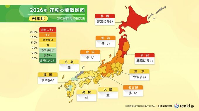 日本気象協会によりますと、飛散量は、西日本では例年並みの地域が多いでしょう。一方、東日本と北日本では例年より多く、非常に多くなる見込みです。