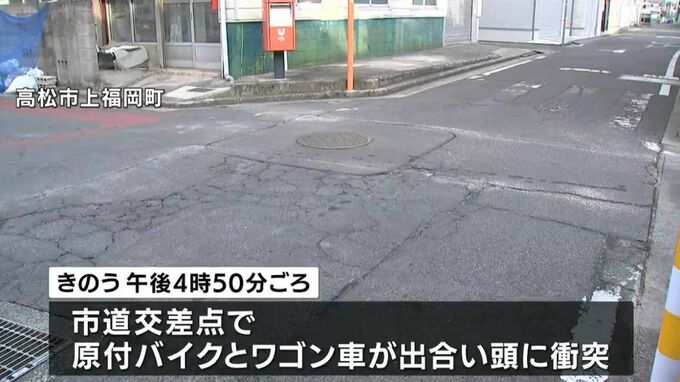警察によりますと、きのう午後4時50分ごろ、高松市上福岡町の市道交差点で、原付バイクとワゴン車が出合い頭に衝突しました。