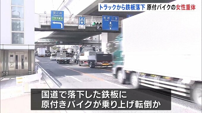 落下していた鉄板に乗り上げ、バイクの女性が重体です。午前7時半ごろ、神戸市東灘区の国道で、走行中の大型トラックから落下した鉄板に原付バイクが乗り上げ、転倒したとみられる事故がありました。バイクを運転…