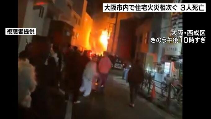 1月14日夜、大阪市内で住宅火災が相次ぎ、計3人が死亡しました。 14日午後10時ごろ、西成区岸里3丁目にある2階建て住宅で、通行人から「1階が燃えている」と、通報がありました。 消防などによります…