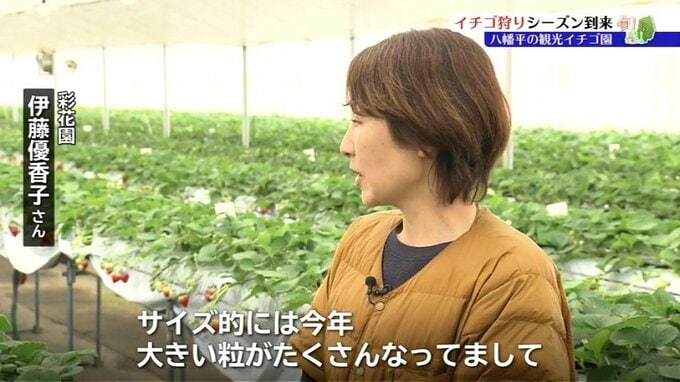 「サイズ的には今年大きい粒がたくさんなっていまして、イチゴ狩りいらっしゃった方はすごく大粒食べられていいかと思います」