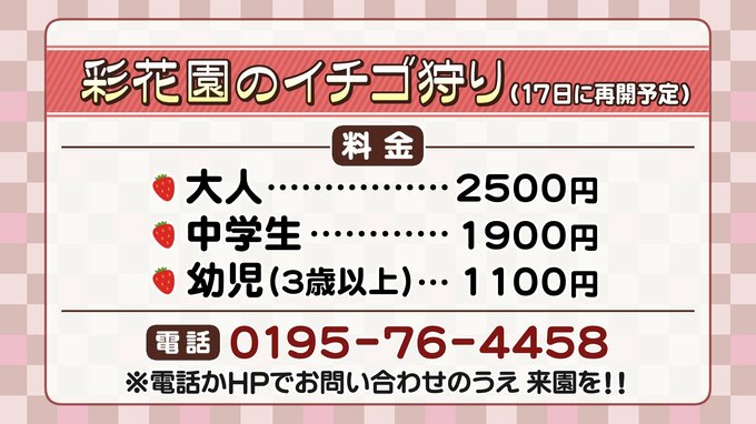 *彩花園のイチゴ狩りは予約制ではないので事前にHPまたは電話で問い合わせしてから訪れてください。また、悪天候の影響でイチゴが熟しておらず、現在イチゴ狩りはお休み中で、17日から再開見込みということです。