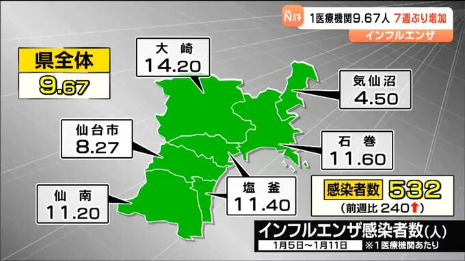 増加は7週ぶりです。1医療機関あたりの感染者数は9.67人で、保健所別では大崎が14.2人と最も多く、次いで石巻で11.6人などとなっています。