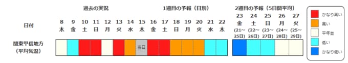 関東甲信地方の気温は、1月20日頃まで寒気の影響を受けにくいため高く、かなり高い日もありますが、その後は寒気の影響を受けやすいため低い日が多く、かなり低くなる可能性があります。気温の変動が大きい見込みです。