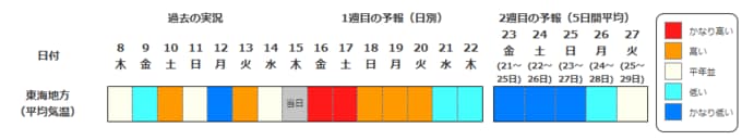 東海地方の気温は、向こう5日間程度は寒気の影響を受けにくいため高く、17日頃まではかなり高いですが、その後は冬型の気圧配置が強まる時期があり、寒気の影響を受けやすいため低い日が多く、21日頃からはかなり低くなる見込みです。気温の変動が大きいでしょう。