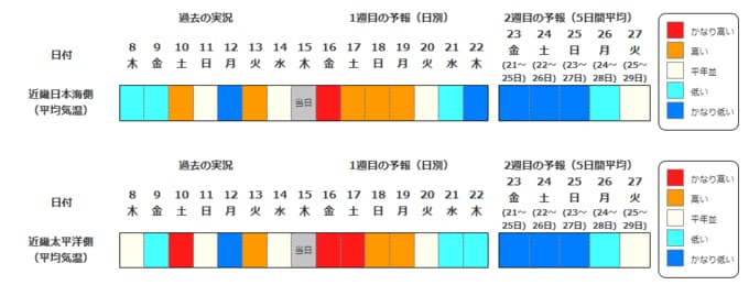 近畿地方の気温は、向こう5日間程度は寒気の影響を受けにくいため高い日が多く、17日頃まではかなり高いですが、その後は冬型の気圧配置が強まる時期があり、寒気の影響を受けやすいため低い日が多く、21日頃からはかなり低くなる見込みです。気温の変動が大きいでしょう。