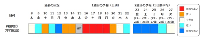 四国地方の気温は、向こう5日間程度は寒気の影響を受けにくいためかなり高い日が多いですが、その後は冬型の気圧配置が強まる時期があり、寒気の影響を受けやすいため低い日が多く、21日頃からはかなり低くなる見込みです。気温の変動が大きいでしょう。