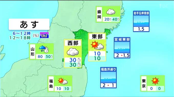 東部は晴れ間が広がりますが、西部では気圧の谷や寒気の影響で雲が多く、にわか雨やにわか雪があるでしょう。海上の強風は、明け方からは一旦おさまりますが午後は再び強まる見込みです。