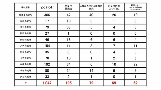 1月5日(月)~11日(日)の熊本県内の、感染性胃腸炎の感染報告は195人で、前の週(75人)の2.6倍に増えています。
