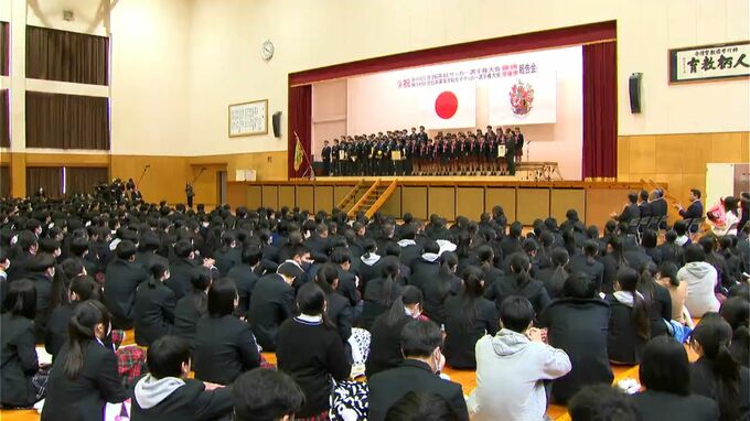15日の報告会では中等部と高等部の生徒およそ1300人が集まり、男女サッカー部の監督・キャプテンが学校や地元からの応援に感謝を述べました。