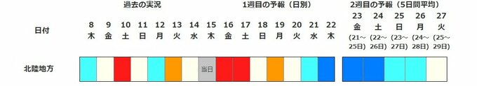 北陸地方の気温は、向こう5日間程度は寒気の影響を受けにくいため平年並か高く、かなり高い日もありますが、その後は冬型の気圧配置が強まる時期があり、寒気の影響を受けやすいため低い日が多く、21日頃からはかなり低くなる見込みだということです。気温の変動が大きく、21日頃からは降雪量がかなり多くなる可能性があるということです。