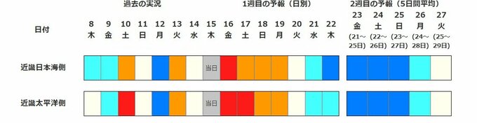 近畿地方の気温は、向こう5日間程度は寒気の影響を受けにくいため高い日が多く、17日頃まではかなり高いですが、その後は冬型の気圧配置が強まる時期があり、寒気の影響を受けやすいため低い日が多く、21日頃からはかなり低くなる見込みだということです。気温の変動が大きく、21日頃からは近畿日本海側で降雪量がかなり多くなる可能性があるということです。