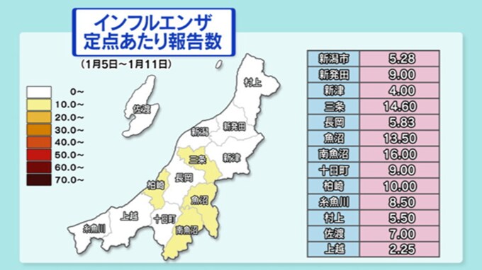 1月11日までの1週間で、新潟県内の医療機関から報告されたインフルエンザの感染者数は、1医療機関あたり7.64人でした。年末から2週連続で、国の示す警報の終息基準を下回ったことから、県は『インフルエンザ警報』を解除しました。
