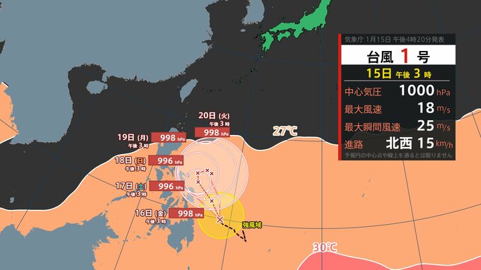 【台風情報】「台風1号」発生 去年より5か月も早い「台風1号」【雨風シミュレーション16日(金)~25日(日)/ 全国各都市の週間予報】気象庁進路予想 南日本放送 2026年1月15日(木) 16:30 国内 天気 【台風1号】と海面水温 台風が発達するために必要な「海面水温27℃」以上の海域は、フィリピン付近までとなっているため、台風はあまり発達せず、日本に近づくことなく「熱帯低気圧」に変わる見込みです。 この記事をはじめから → 【台風1号】発生 気になる進路は