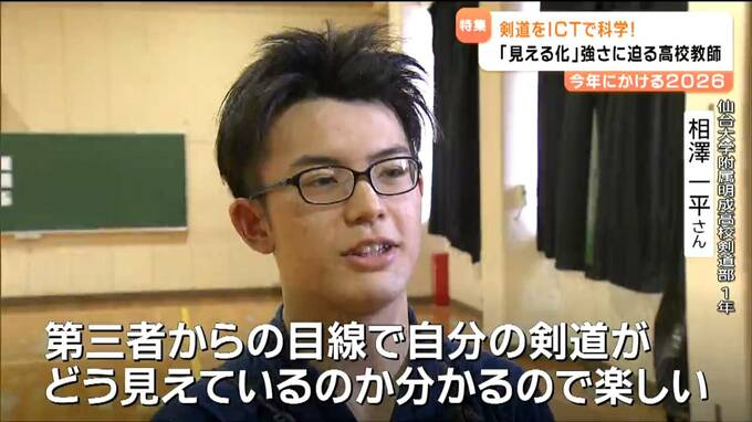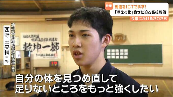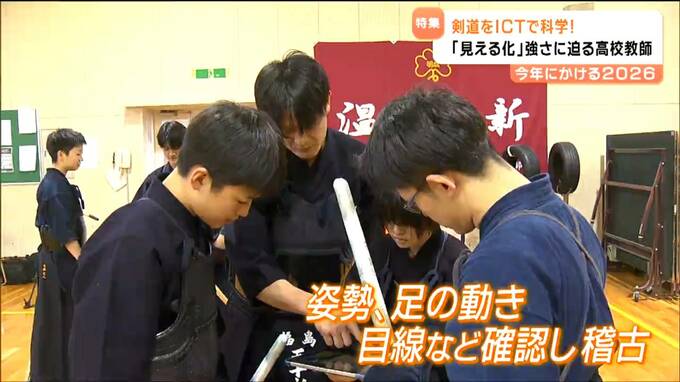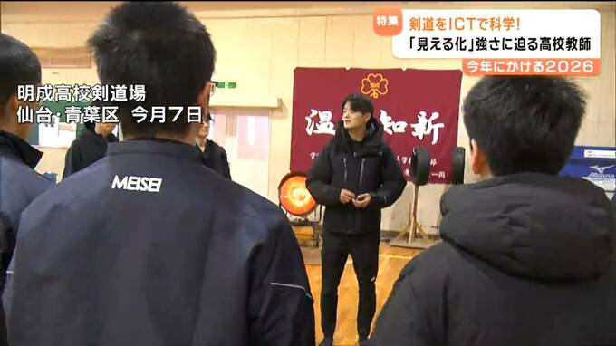 新年を迎え、五十嵐先生の姿は明成高校の剣道場にありました。この日は冬休み最後の稽古。ここでもICT機器を使って指導します。タブレット端末を使って姿勢や足の動き、目線の高さなど一つひとつを確認しながら、新たな目標に向けて稽古に励んでいました。