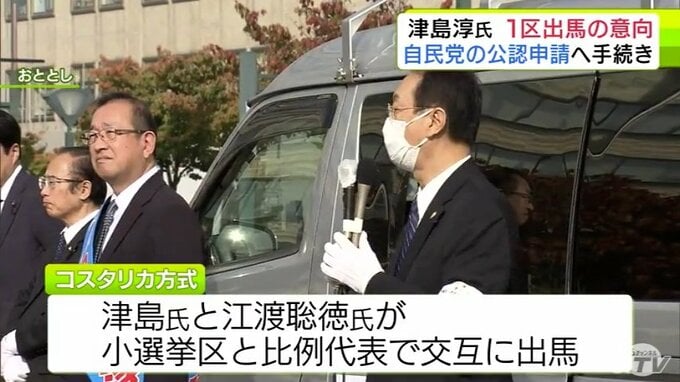 自民党は2017年からコスタリカ方式を導入し、津島 氏と衆議院議員の江渡聡徳 氏の2人が小選挙区と比例代表を交互に入れ替えて出馬していて、次の衆院選では、津島 氏が比例から出馬する予定でした。