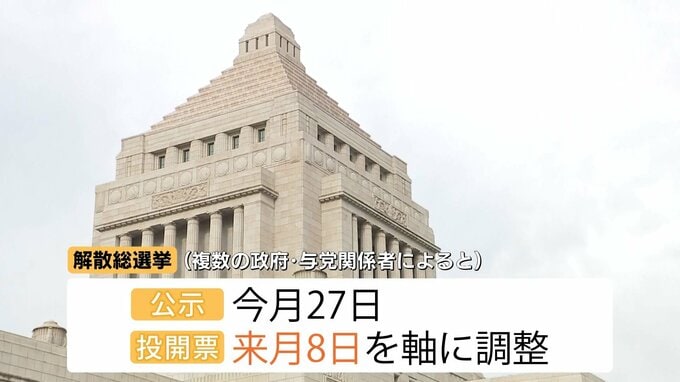 複数の政府・与党関係者によりますと、解散総選挙は1月27日公示、2月8日投開票の日程を軸に調整が進められています。