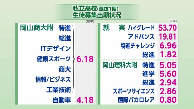 「岡山商大附属・就実・岡山理大附属」の全学科・コースの出願倍率は【画像②】に掲載しています。就実のハイグレードクラスは、53.70倍と最も高い倍率です。岡山理大附属のグローバルサイエンスコース進学クラスは、5.60倍となっています。