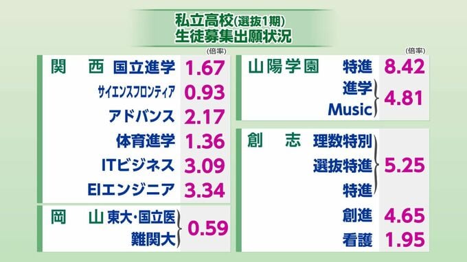 「関西・岡山・山陽学園・創志学園」の全学科・コースの出願倍率は【画像①】に掲載しています。関西のEIエンジニアは3.34倍となっています。山陽学園は特進が8.42倍、創志学園の特進は5.25倍。岡山は0.59倍と定員割れです。