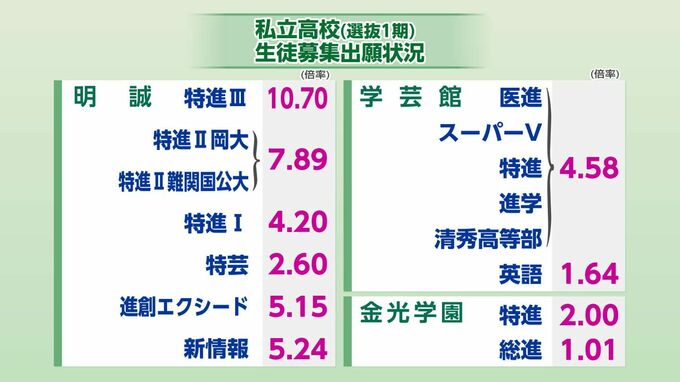【全校の倍率掲載】岡山県私立高校入試2025志願倍率・1期 就実のハイグレードクラス53.70倍 岡山龍谷・特進37.00倍 倉敷・特進アドバンス14.53倍 作陽学園・進学チャレンジクラス14.51倍 明誠学院・特別進学Ⅲ類10.70倍【1月16日発表】 RSK山陽放送 2026年1月16日(金) 10:19 国内 明誠学院・岡山学芸館・金光学園 「明誠学院・岡山学芸館・金光学園」の全学科・コースの出願倍率は【画像③】に掲載しています。明誠学院の特別進学コースⅢ類は10.70倍となっています。岡山学芸館の普通は4.58倍、金光学園の特別進学クラスは2.00倍です。 【画像③】