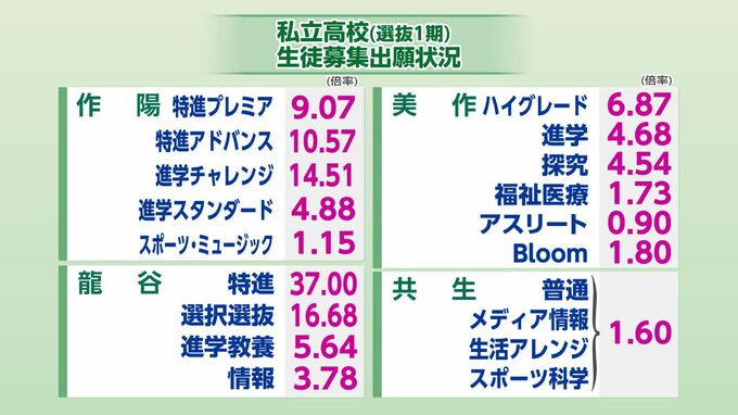 【全校の倍率掲載】岡山県私立高校入試2025志願倍率・1期 就実のハイグレードクラス53.70倍 岡山龍谷・特進37.00倍 倉敷・特進アドバンス14.53倍 作陽学園・進学チャレンジクラス14.51倍 明誠学院・特別進学Ⅲ類10.70倍【1月16日発表】 RSK山陽放送 2026年1月16日(金) 10:19 国内 作陽・岡山龍谷・美作・共生 「作陽・岡山龍谷・美作・共生」の全学科・コースの出願倍率は【画像⑤】に掲載しています。岡山龍谷の特別進学が37.00倍、作陽の進学チャレンジクラスが14.51倍となっています。 【画像⑤】
