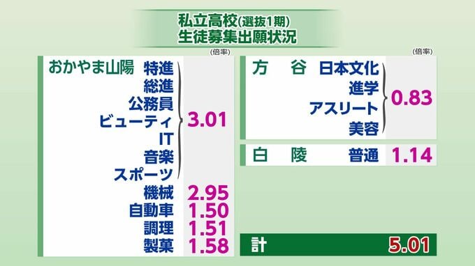 【全校の倍率掲載】岡山県私立高校入試2025志願倍率・1期 就実のハイグレードクラス53.70倍 岡山龍谷・特進37.00倍 倉敷・特進アドバンス14.53倍 作陽学園・進学チャレンジクラス14.51倍 明誠学院・特別進学Ⅲ類10.70倍【1月16日発表】 RSK山陽放送 2026年1月16日(金) 10:19 国内 おかやま山陽・方谷學舎・岡山白陵 「おかやま山陽・方谷學舎・岡山白陵」の全学科・コースの出願倍率は【画像⑥】に掲載しています。方谷學舎は定員割れです。 【画像⑥】