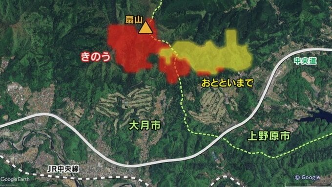 【LIVE画像あり】山林火災8日目 今日も鎮火のめど立たず これまでに200ヘクタール余りの山林が焼ける 山梨・扇山 テレビ山梨 2026年1月15日(木) 18:55 国内 こちらは延焼した範囲を示した地図です。 黄色で塗ったエリアは今月8日の発生から13日までの延焼範囲で、ほぼ上野原市ですが、14日は赤く塗ったエリア、西側の大月市側に範囲が拡大しました。