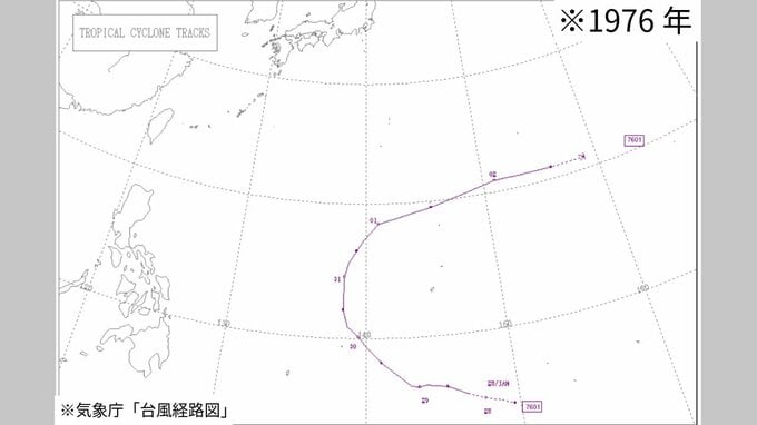 発生後に北東(東側)へ大きくカーブを切った例です。しかし、日本列島に近づく前に、はるか南の海上で勢力を弱め、熱帯低気圧に変わりました。
