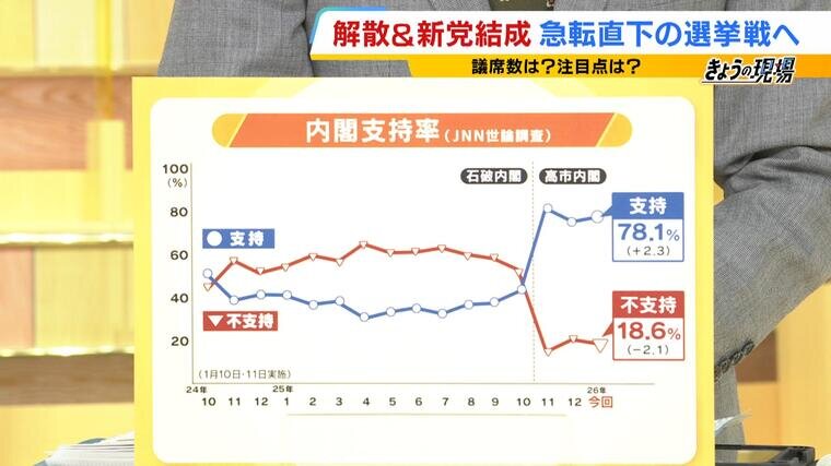 JNNの世論調査(1月10日・11日実施)によると、現在の高市内閣の支持率は78.1%と非常に高い水準にあります。この高支持率を背景に押し切られるとみられる解散総選挙ですが、野党側は一斉に反発しています。