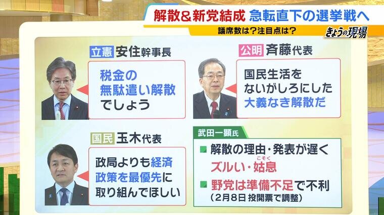 立憲民主党の安住淳幹事長は「税金の無駄遣い解散だ」と批判。衆議院選挙には約600億〜800億円もの国費が投じられます。国民民主党の玉木雄一郎代表は「政局よりも経済政策を最優先に」と訴え、公明党の斉藤鉄夫代表も「大義なき解散」と厳しい表情を見せています。