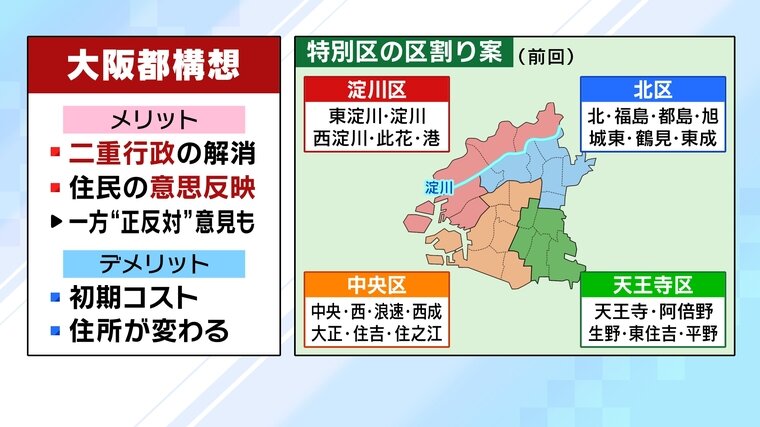 そもそも現在の維新は、都構想の具体的な制度設計を明示していません。前回は大阪市を4つの特別区(淀川区、北区、中央区、天王寺区)に再編する案でしたが、3度目の構想内容は不明です。