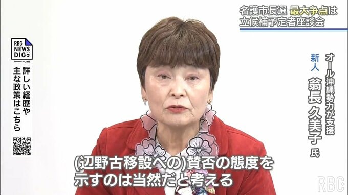 任期満了に伴い今月25日に実施される名護市長選挙に向け、RBCと沖縄タイムスは政党からの推薦を受けて立候補を予定している2人による座談会を開催しました。今月18日の告示を前に15日と16日の前後編2回にわたって、その模様をお伝えします。前編は選挙戦の争点や物価高対策についてです。