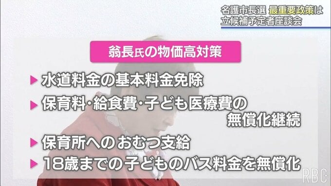 翁長さんはこのほかにも物価高対策として水道料金の基本料金免除や、保育料、給食費、子ども医療費の3つの無償化の継続に加え、保育所へのおむつの支給、18歳までの子どものバス料金を無償化するとしています。