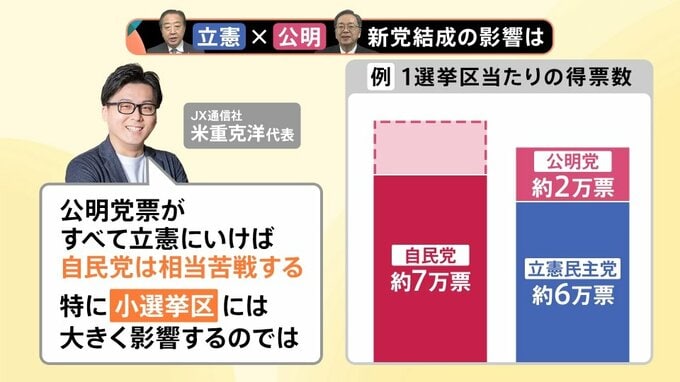 立憲民主党と公明党の新党結成の影響について、JX通信社の米重克洋代表は、「公明党票がすべて立憲にいけば、自民党は相当苦戦する。特に小選挙区には大きく影響するのではないか」と話しています。