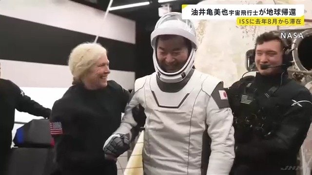 油井亀美也さんら4人の宇宙飛行士が乗った宇宙船は、日本時間の午後5時40分すぎにアメリカ・カリフォルニア州の沖合に着水しました。宇宙船から出てきた油井さんは笑顔で手を振り、元気な様子を見せていました。
