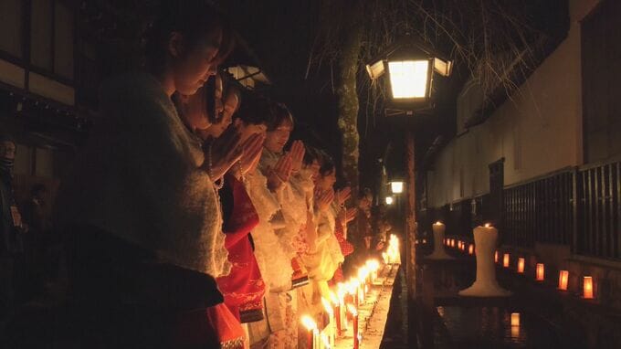市内を流れる瀬戸川沿い では灯籠流しも行われ訪れた人たちはろうそくに火を灯し、手を合わせていました。